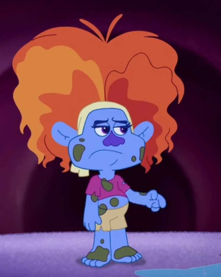 Baha is a blue-skinned Troll with curly ginger hair. She wears a magenta T-shirt, beige shorts and a white headband. Some parts of her body is covered in mud.