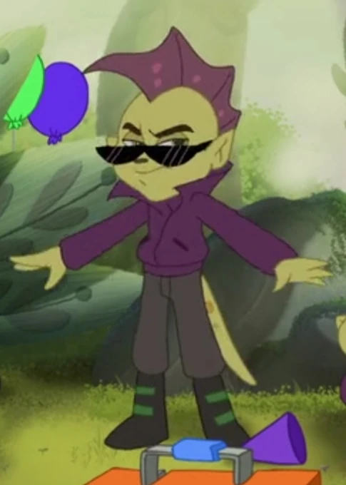 Bash has a goblin-like appearance. He has green skin, an animal-like nose, a tail, fanged teeth and a fin on his head that imitates a mohawk. He wears a biker outfit, consisting of a purple jacket, grey pants and black boots and shades.