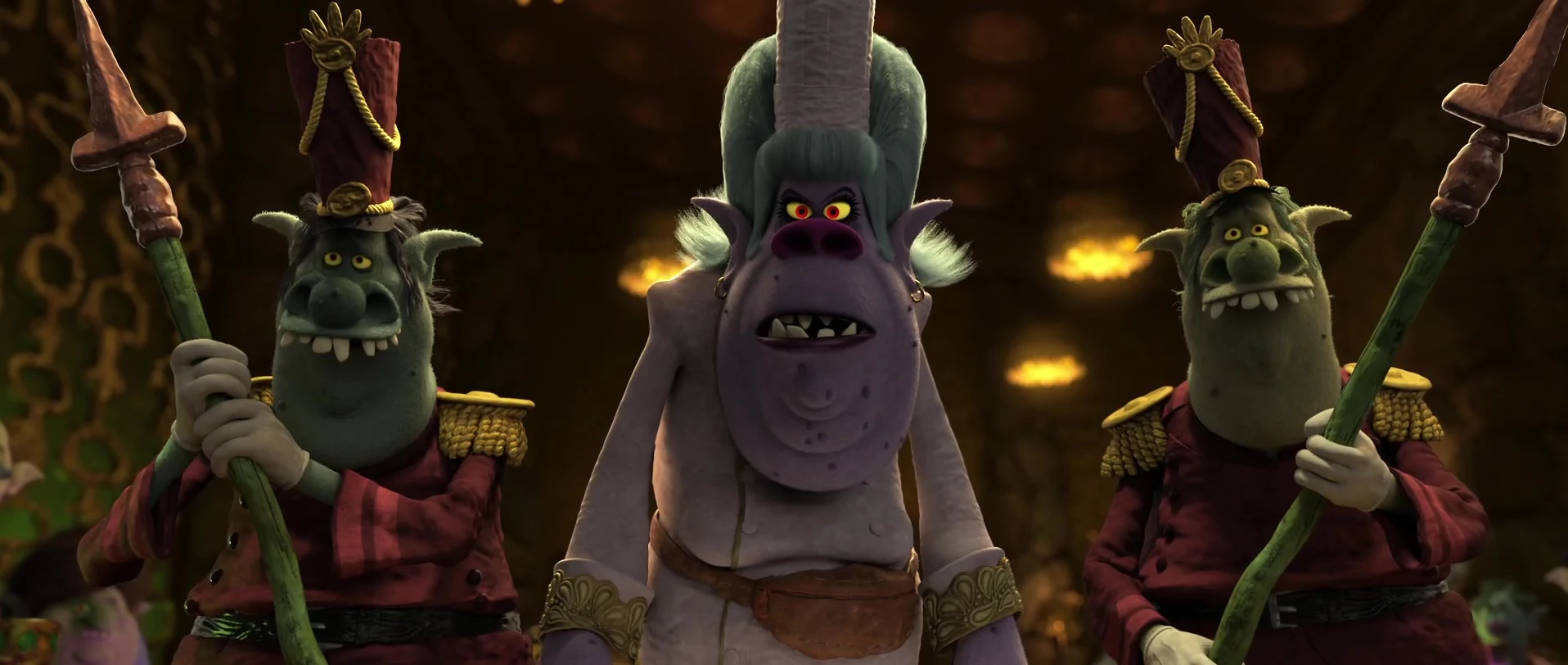Despite the technology they do have, Chad and Todd were shown using partisan-like polearms. They are one of the few societies to use military weapons in the Trolls World that specifically is designed to be weapons only, yet the weapons they use are dated compared to the rest of their technology.