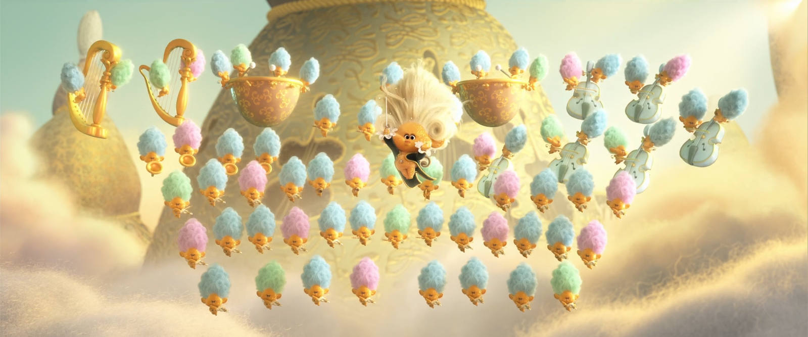 At some point in the past, the ancestors of the 6 Tribes created 6 Strings for each type of music after one made a sound. As their name suggests, they were centered around Classical music and they held the String of Classical song. They partied with the other Trolls celebrating their music and everything in between with the other Tribes. However, the Pop Trolls stole the white harp housing the Strings and decided to keep all the music to themselves. As a drastic measure, the other 5 Tribes grabbed their strings and ran. The Classical Tribe settled in the mountains.