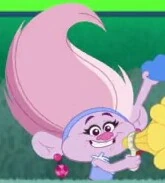 She still has the Glitter Troll vanity as in "Doc Doc, Who's There?". When Queen Poppy goes to cut her gum out of her hair, she is upset Poppy will destroy the best haircut that she ever had. Yet, her apparent wearing of clothes is odd among Glitter Trolls, as most of them find clothes gross, which is exampled in "Truth or Dare". It is unknown why she is an exception.