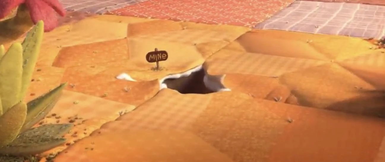 A subterranean mine located outside of town near a cactus patch. Hickory jumped over it at one point to try and outrun Delta, who was pursuing Poppy's group with her posse when they escaped jail. And at another point while chasing the trio, Delta’s niece, Clampers fell into it.