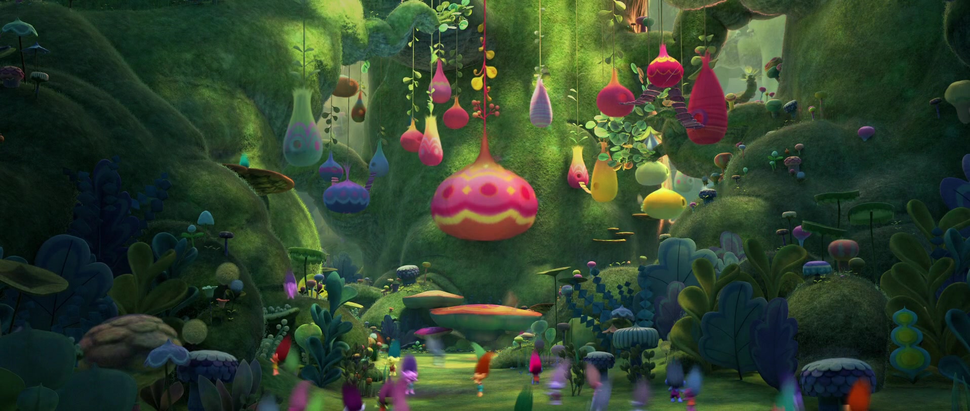 The village consists mostly of "pods", which are built by the Pop Trolls out of their hair, making them biodegradable. They resemble tree decorations such as Christmas tree ornaments. In Trolls, they glowed at night or when flicked open by force.