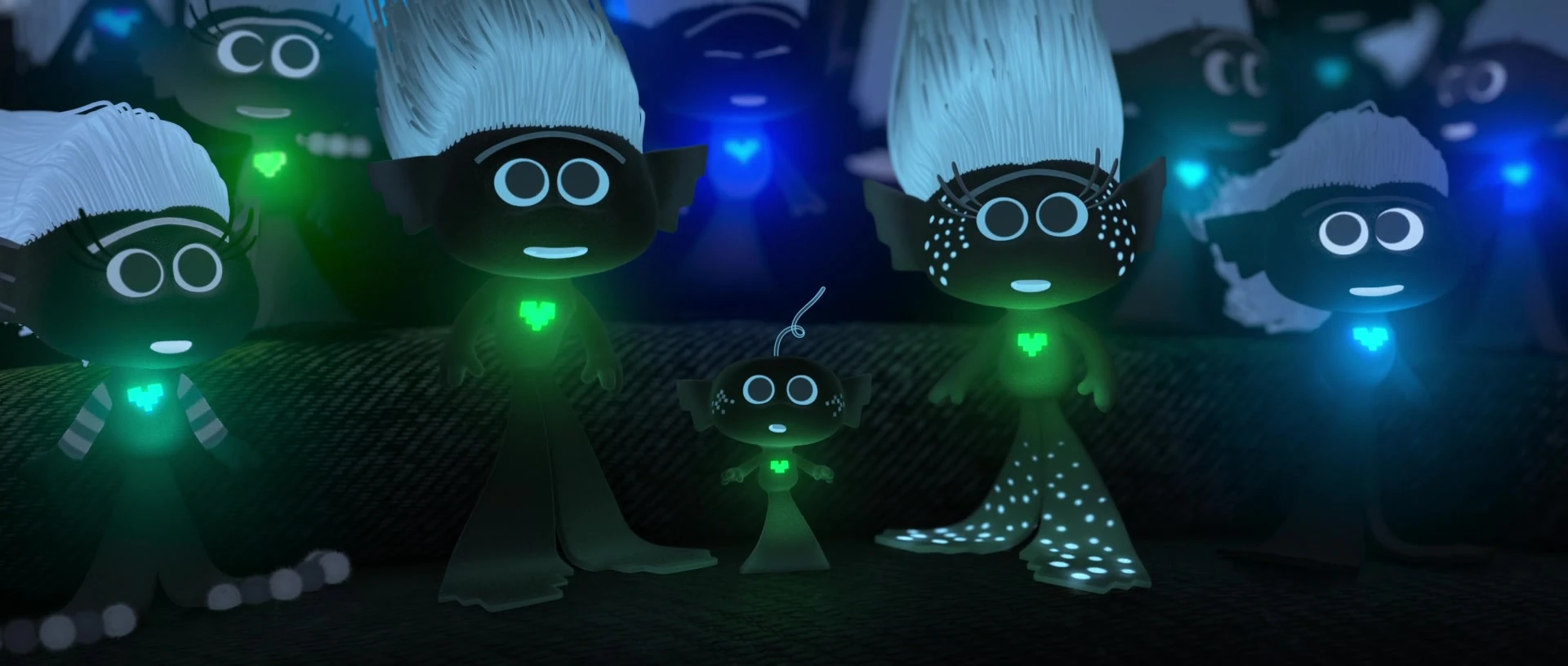 Techno Trolls showing both blue and green glowing hearts before Just Sing.